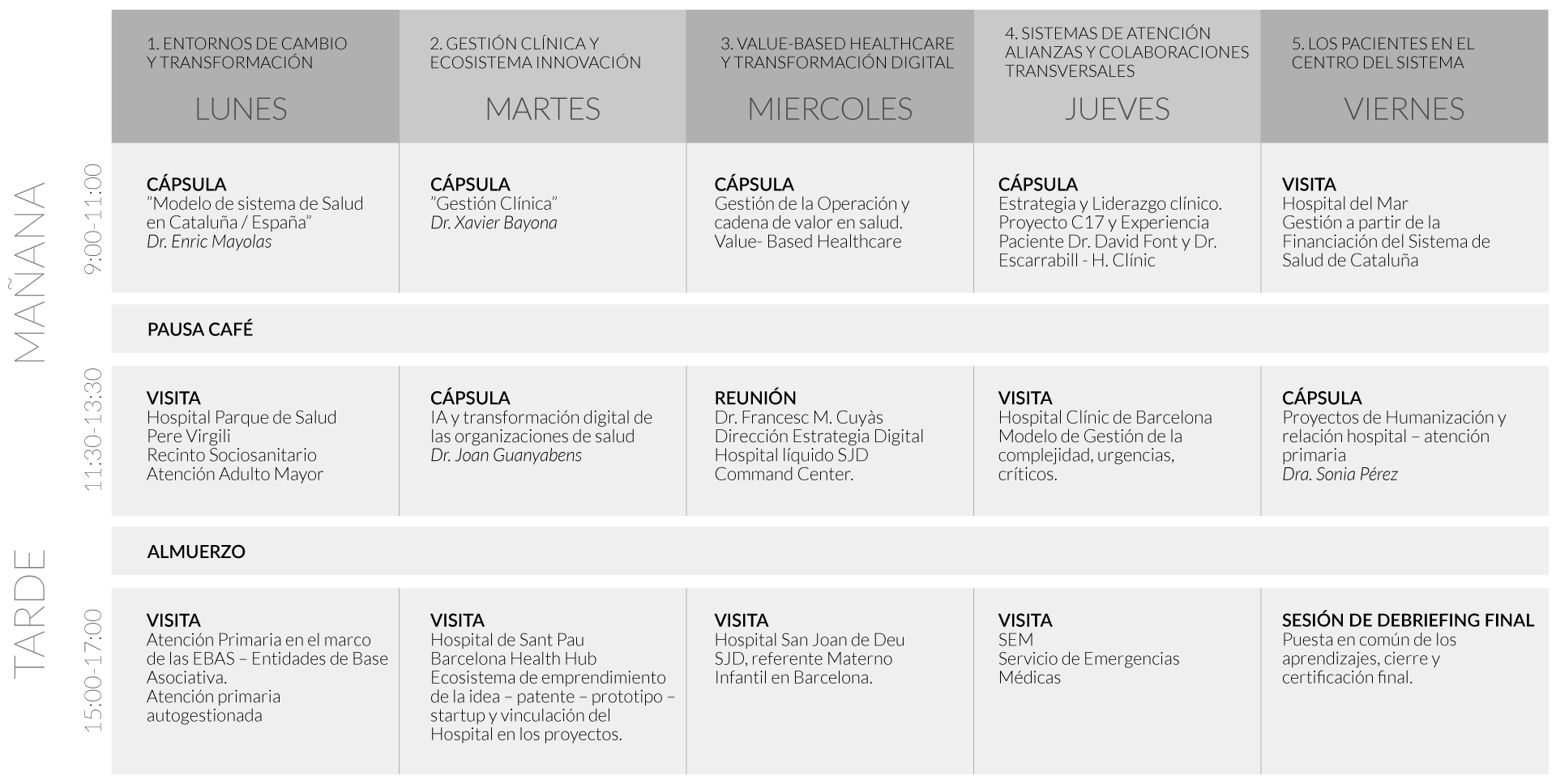 Junto a la Universidad de Manresa hemos diseñado este programa académico en Barcelona con el propósito de conocer, de primera fuente, experiencias exitosas de transformación digital en el ámbito de la atención y gestión en salud, tanto en el nivel hospitalario como en la atención primaria.